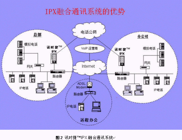 將訊時(shí)捷?IPX放在公司總部,其它分支機(jī)構(gòu)可以通過IP話機(jī),軟電話或者網(wǎng)關(guān)設(shè)備登錄到總部的IPX上,這樣就形成了整個(gè)公司的VOIP網(wǎng),建立了企業(yè)自己的通訊平臺。
