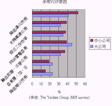 根據(jù)美國著名的咨詢公司 The Yankee Group 2005 年的調(diào)研各企業(yè)使用VOIP的原因,大企業(yè)與中小企業(yè)略有差異:大企業(yè)認(rèn)為網(wǎng)絡(luò)管理、省錢、促進(jìn)工作效率為最關(guān)鍵的三個(gè)原因;中小企業(yè)則認(rèn)為省錢、網(wǎng)絡(luò)管理容易、支持高速應(yīng)用、促進(jìn)工作效率為主要原因。
