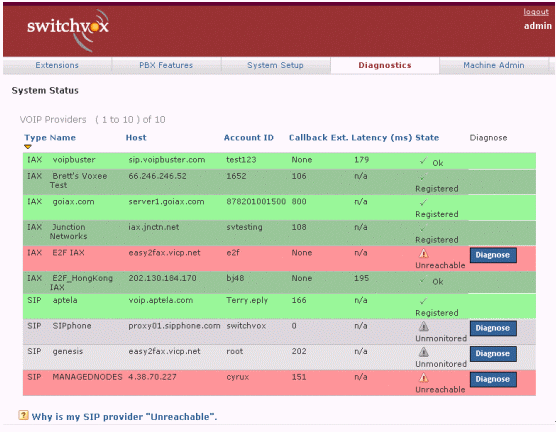 圖5中綠色表示正常,紅色表示出現(xiàn)問題,白色表示從沒有接通過。如果你按診斷(Diagnose),系統(tǒng)便會(huì)通過自動(dòng)測試,告訴你問題出自哪一部分。如果需要對每一個(gè)的詳細(xì)解析,可以按底部Why這個(gè)標(biāo)題,找尋答案。類似的終端、話機(jī)等配置、硬件診斷等,也有非常明了的界面與解決問題的辦法。