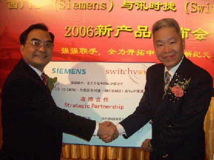 2006年3月29日的北京,還有些春風(fēng)料峭,但北京長富宮的芙蓉廳卻是暖意融融,德國通訊業(yè)巨擘西門子(Siemens)和美國企業(yè)通訊業(yè)新寵訊時(shí)捷(Switchvox)聯(lián)合舉辦VoIP新產(chǎn)品發(fā)布會(huì),西門子終端通訊設(shè)備(上海)有限公司CEO