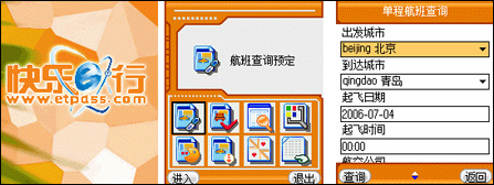 “快樂e行”預(yù)裝在手機中的存儲卡中,可直接安裝到手機的應(yīng)用菜單欄里,點擊圖標(biāo),就可以直接進入首頁。圖形化的操作按鍵、簡明的文字提示、順暢的操作流程,人性化的設(shè)計讓機票預(yù)訂變得不再麻煩。