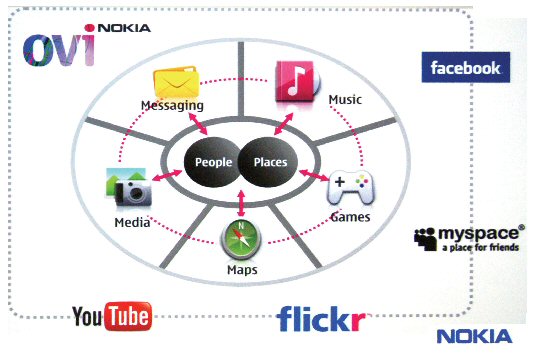 圍繞基于位置的社區(qū)服務(wù)(Social Location)而建立,是Ovi商店的一大特色;谖恢玫纳鐓^(qū)服務(wù),意味著這種服務(wù)是建立在諸如“你在哪兒”、 “要到哪兒去”、“跟誰會(huì)面”、“誰是你的親密朋友”、“你想得到什么樣信息”等基礎(chǔ)上的。