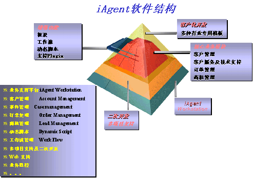 iAgent3.0從軟件內(nèi)部的結(jié)構(gòu)體系上加以突破,統(tǒng)一開(kāi)放的應(yīng)用平臺(tái)上組合功能強(qiáng)大的二次開(kāi)發(fā)工具,并在此基礎(chǔ)上加以針對(duì)行業(yè)而特別設(shè)計(jì)的功能模板。更好的適應(yīng)了企業(yè)處理流程的多樣化和需求的復(fù)雜化,并為企業(yè)高速的業(yè)務(wù)增長(zhǎng)和功能需求增長(zhǎng)帶來(lái)極大的拓展空間。軟件結(jié)構(gòu)如下圖所示:
