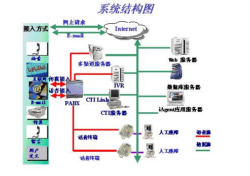 滿(mǎn)足呼叫中心多渠道接入的需求,使Internet呼叫中心成為現(xiàn)實(shí)。將網(wǎng)上ip電話(huà)請(qǐng)求納入傳統(tǒng)語(yǔ)音呼叫統(tǒng)一管理,無(wú)縫集成Email,傳真功能,實(shí)現(xiàn)網(wǎng)頁(yè)的互推瀏覽,文字交談,ip電話(huà),網(wǎng)上資料發(fā)送等功能。
