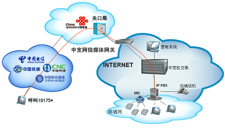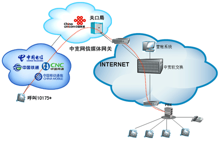 企業(yè)自行從網(wǎng)站上成功申請(qǐng)“企業(yè)商務(wù)通” 業(yè)務(wù)后,通過(guò)101756*全國(guó)統(tǒng)一接入號(hào)后結(jié)合中寬網(wǎng)信推薦的IPPBX,當(dāng)外部對(duì)企業(yè)申請(qǐng)的10175*號(hào)碼發(fā)起呼叫時(shí),該呼叫通過(guò)中國(guó)聯(lián)通的線路將話務(wù)指向中寬網(wǎng)信的媒體網(wǎng)關(guān),由中寬軟交換平臺(tái)將呼叫送至指定的IP