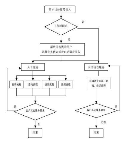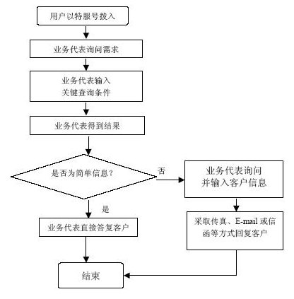 系統(tǒng)自動報受理人員工號,人工交互式受理方式。受理人員根據(jù)用戶要求從服務(wù)質(zhì)量標準數(shù)據(jù)庫、電費數(shù)據(jù)庫和其他相連的數(shù)據(jù)庫查詢資料,然后通過語音方式播報資料或送到用戶指定的傳真機或其他終端設(shè)備上。主要內(nèi)容如下: