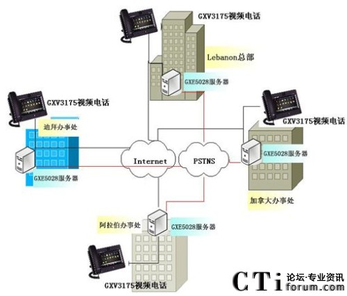 在Tabbara公司的全球四個(gè)辦事處分別安裝潮流網(wǎng)絡(luò)的GXE5028 IPPBX服務(wù)器或者其他的SIP Sever通信平臺(tái),GXE5028 IP PBX支持語音信箱,郵件和其他通信功能應(yīng)用,每一臺(tái)GXE5028最大限度地支持分布全球辦事處的所有通信賬號(hào)同時(shí)連接到同一網(wǎng)絡(luò)中,終端連接IP電話,IP視頻電話以及IP視頻監(jiān)控?cái)z像機(jī)作為語音/數(shù)據(jù)的輸入輸出,當(dāng)然IP PBX也可通過網(wǎng)絡(luò)連接到VoIP服務(wù)器中間位置的SIP中繼。潮流網(wǎng)絡(luò)的GXV3175多媒體觸摸屏視頻電話,支持標(biāo)準(zhǔn)的SIP協(xié)議,先進(jìn)的H.264/H.263/H.263+視頻壓縮標(biāo)準(zhǔn),寬大的7寸彩色觸摸顯示屏實(shí)現(xiàn)溝通面對面的零距離交流,以及撥打網(wǎng)絡(luò)攝像機(jī)觀看監(jiān)控現(xiàn)場。潮流網(wǎng)絡(luò)的GXV3662_HD高清防暴半球IP攝像機(jī)和GXV3651_HD IP攝像機(jī),分別安裝在辦事處關(guān)鍵位置,365天,每周24*7個(gè)小時(shí)進(jìn)行實(shí)時(shí)監(jiān)控,作為企業(yè)財(cái)產(chǎn)和人員安全的保障。方案中,各分支機(jī)構(gòu)之間通話免費(fèi),撥打分支機(jī)構(gòu)所在地其他電話按市話費(fèi)算,出差人員使用IP電話與公司內(nèi)部通話免費(fèi)。