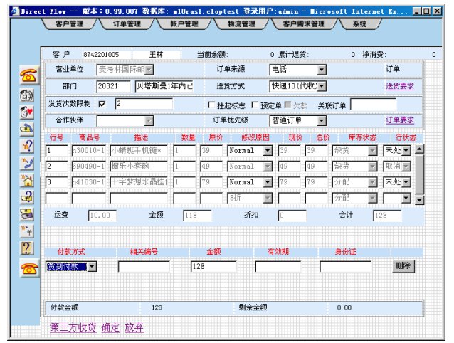 如果客戶訂單采用匯款支付方式,當(dāng)財(cái)務(wù)部門收到到款通知,并輸入CRM系統(tǒng),系統(tǒng)會(huì)向發(fā)貨部門下達(dá)發(fā)貨工單。如果客戶訂單采用一卡通支付方式,系統(tǒng)確認(rèn)支付無誤就立即向發(fā)貨部門下達(dá)發(fā)貨工單,整個(gè)過程全部自動(dòng)化。
