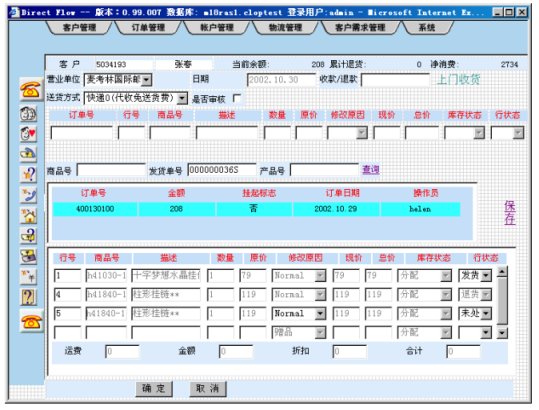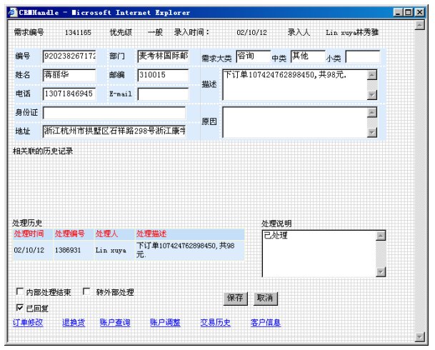 客戶還可以選擇網(wǎng)上訂貨,只要訪問麥考林的網(wǎng)站(www.m18.com),并輸入有關(guān)需求信息,系統(tǒng)會(huì)產(chǎn)生訂貨工單。訂貨工單被CRM后臺(tái)派發(fā)給座席代表,座席代表根據(jù)工單采用外撥方式聯(lián)系客戶,進(jìn)行訂貨確認(rèn)。之后的處理流程同電話訂貨相同。