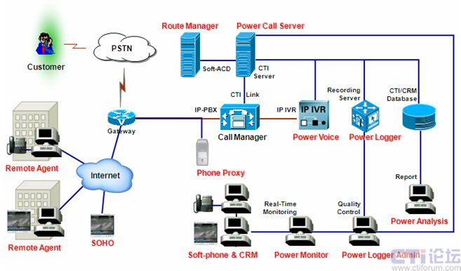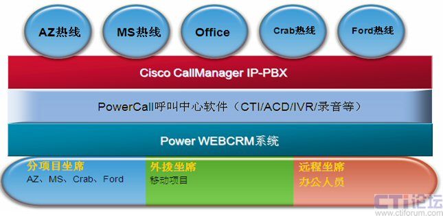 系統(tǒng)采用CISCO CallManager IP-PBX作為語音平臺,PCS提供全套軟件,包括:CTI、排隊、IP-IVR、錄音和CRM,對MicroCall外包呼叫中心的各項需求都給出了滿意的解決方案。