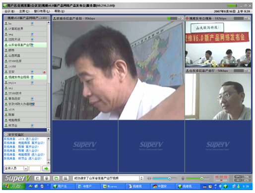 2007年8月16日,視維視頻會(huì)議V6.0新產(chǎn)品網(wǎng)絡(luò)發(fā)布會(huì)在美麗的泉城濟(jì)南舉行,山東省信息產(chǎn)業(yè)廳、濟(jì)南市信息產(chǎn)業(yè)局的領(lǐng)導(dǎo)、山東省電信等上級(jí)主管部門領(lǐng)導(dǎo),視維產(chǎn)品新老用戶和有視頻會(huì)議需求的潛在客戶,國(guó)內(nèi)外合作伙伴,IT168、中國(guó)計(jì)算機(jī)報(bào)、電腦商報(bào)、C114、支點(diǎn)網(wǎng)、計(jì)算機(jī)世界、CTI論壇、投影時(shí)代等國(guó)內(nèi)知名媒體100多人參加了這次網(wǎng)絡(luò)發(fā)布會(huì)。在此次會(huì)議上,山大聯(lián)潤(rùn)公司通過視頻會(huì)議與各地與會(huì)者進(jìn)行了良好的溝通,同時(shí)這次發(fā)布會(huì)開創(chuàng)了用視頻會(huì)議發(fā)布新產(chǎn)品的先河。