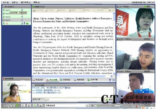 CTI論壇(ctiforum)10月16日消息:近日,世衛(wèi)組織用視維Super-V視頻會(huì)議軟件召開亞太地區(qū)會(huì)議,討論第三屆APEDNN的各項(xiàng)議題。參加會(huì)議的成員主要有中國(guó)、菲律賓、新加坡、馬來(lái)西亞、緬甸、日本、泰國(guó)等幾十個(gè)國(guó)家和地區(qū)的代表。