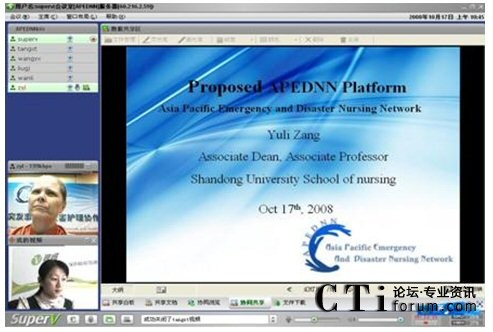 視維視頻會(huì)議系統(tǒng)良好的兼容性,使亞太地區(qū)各成員國(guó)的代表雖遠(yuǎn)隔千山萬(wàn)水,依然可以實(shí)現(xiàn)無(wú)限溝通。視維視頻會(huì)議系統(tǒng)所提供的清晰流暢的音視頻使各成員國(guó)的代表無(wú)需走出國(guó)門,無(wú)需聚到一起,就可以輕松地網(wǎng)絡(luò)面對(duì)面的進(jìn)行交流,既可節(jié)約差旅費(fèi)用,又可避免舟車勞頓之苦,是各國(guó)代表有更多精力投入到工作中;視維的共享白板、共享文檔、文件下載等強(qiáng)大的數(shù)據(jù)協(xié)作功能可以使各國(guó)代表快速地共享更多的信息、資料,及時(shí)地開展越洋培訓(xùn)。近日網(wǎng)絡(luò)面對(duì)面地討論第三屆APEDNN的進(jìn)程及各項(xiàng)議題就是一次典型的應(yīng)用之一,不僅節(jié)約了差旅和時(shí)間成本,而且提高了工作效率,拉近世衛(wèi)各成員國(guó)之間的距離,天涯若比鄰,是各國(guó)代表在工作上更為默契,提高人類應(yīng)對(duì)突發(fā)事件與災(zāi)害的能力。