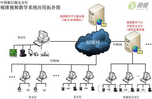 中國(guó)銀行湖北分行的視頻教學(xué)系統(tǒng)由服務(wù)器端和客戶端組成,服務(wù)器端軟件部署在省分行中心機(jī)房,配置2臺(tái)服務(wù)器,對(duì)于接受點(diǎn)超過5個(gè)的分支機(jī)構(gòu)配置二級(jí)轉(zhuǎn)發(fā)服務(wù)器,共支持全省各支行及支行內(nèi)多個(gè)客戶端同時(shí)在線,負(fù)責(zé)所有培訓(xùn)的召集、音視頻交互、加密等工作,各支行通過WEB方式即可實(shí)現(xiàn)客戶端軟件的自動(dòng)安裝與升級(jí),輕松實(shí)現(xiàn)實(shí)現(xiàn)省分行以及各支行共77余個(gè)接受點(diǎn)的高清音視頻視頻教學(xué)。同時(shí)為中國(guó)銀行湖北分行的視頻教學(xué)系統(tǒng)配置異構(gòu)兼容模塊,支持與其他視頻會(huì)議及軟、硬件視頻教學(xué)系統(tǒng)無縫融合,避免重復(fù)投資造成的浪費(fèi)。網(wǎng)絡(luò)拓?fù)鋱D如下: