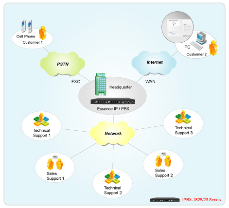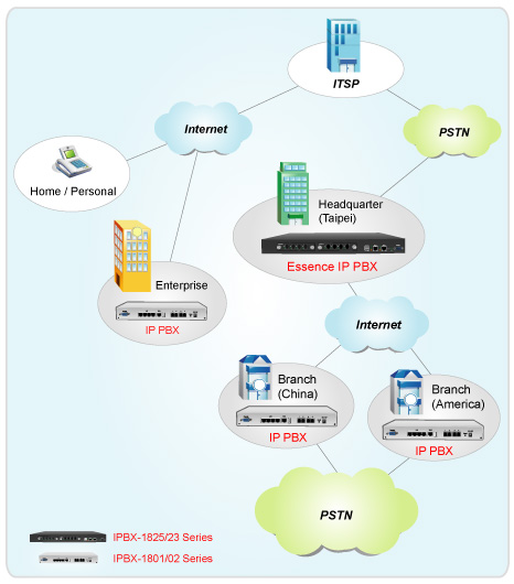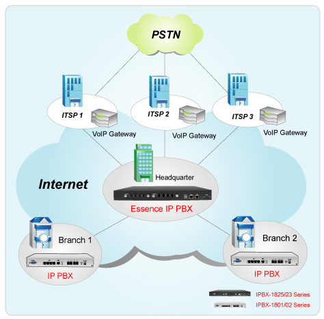 Essence IPBX系列可以注冊者之形式注冊于其他SIP協定伺服器上,如ITSP運營平臺,或是分公司之小型IP PBX注冊至總公司之大型IP PBX ,均可透過Internet 將話務無限延伸。