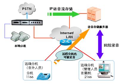 迅時通信采用數(shù)字化集成的技術(shù),在OM系列IPPBX上直接融入了電話錄音功能。無論是在模擬分機或IP分機上通話,還是模擬外線或與IP外線的通話,OM通過其強大的語音處理器直接生成數(shù)字化的語音文件,并通過網(wǎng)絡(luò)將錄音文件保存在用戶指定的服務(wù)器上。如圖所示。