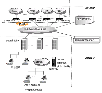 VAN(Voice Area Network)是一個(gè)支持多接入點(diǎn)、多承攬點(diǎn)、多業(yè)務(wù)點(diǎn)、多數(shù)據(jù)點(diǎn)的大型分布式呼叫中心構(gòu)造平臺(tái)。它針對(duì)大型分布式呼叫中心、企業(yè)營(yíng)銷網(wǎng)絡(luò)及行業(yè)公共交換平臺(tái)的業(yè)務(wù)需求和技術(shù)需求開發(fā),支持多種接入方式并具備多種服務(wù)處理手段,同時(shí)可利用其軟件平臺(tái)——DCCMS呼叫管理系統(tǒng)對(duì)多種業(yè)務(wù)進(jìn)行分散式管理,對(duì)各類資源進(jìn)行統(tǒng)一控制,實(shí)現(xiàn)全網(wǎng)數(shù)據(jù)協(xié)同管理。