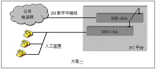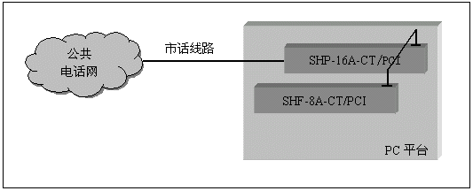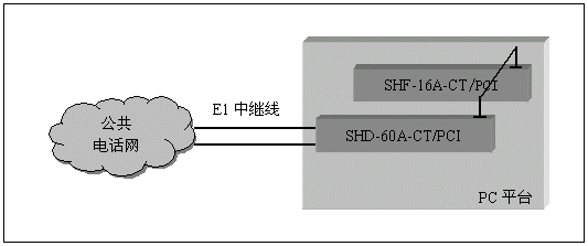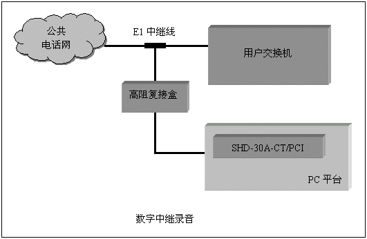 通道數(shù)較多的大中型應(yīng)用系統(tǒng),一般采用數(shù)字中繼線(E1)接入公共電話網(wǎng),三匯公司的SHD系列數(shù)字中繼卡可以提供相應(yīng)的解決方案。SHD系列數(shù)字中繼在一塊卡上集成了E1線接口,語(yǔ)音資源,信令處理等所必須的全部功能,其接入信令處理模塊可處理中國(guó)1號(hào)信令(SS1),7號(hào)信令(SS7),ISDN PRI協(xié)議(DSS1),單塊卡最多可支持4個(gè)E1接入。通過CT-BUS(或ST-BUS)總線,還可以在數(shù)字中繼線上實(shí)現(xiàn)傳真功能。典型應(yīng)用結(jié)構(gòu)如下圖: