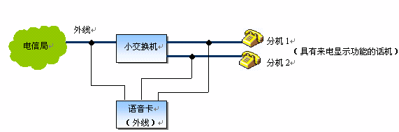 說明:將語音卡的外線通道并接在小交換機(jī)的全部?jī)?nèi)外線端口上,在軟件的控制下,不僅可以將外線來電號(hào)碼轉(zhuǎn)發(fā)至分機(jī),并且還可以在內(nèi)線通話時(shí),看到通話對(duì)方的號(hào)碼,非常實(shí)用。當(dāng)然,如果直接采用語音卡(外線+座席)來構(gòu)成小交換機(jī),則系統(tǒng)更為簡(jiǎn)潔,成本也大為降低。