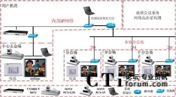 本次系統(tǒng)根據(jù)各會場不同規(guī)模的應(yīng)用,共采用了1臺Sony PCS-G50P、29臺Sony PCS-1P,每臺終端還配置了用于PC圖文傳輸?shù)碾p流盒,共30個。多點(diǎn)控制單元(MCU)采用超然的VmediaX VX4000-T(32個點(diǎn))。系統(tǒng)拓?fù)鋱D如下: