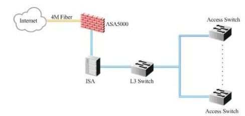 辦公專用網(wǎng)通過一條4M光纖線路連入CNC網(wǎng)絡(luò),在酒店內(nèi)部安裝了ASA5000和ISA等安全管理設(shè)備,ISA承擔了NAT等功能;辦公網(wǎng)的信息點數(shù)量大概在200個左右。