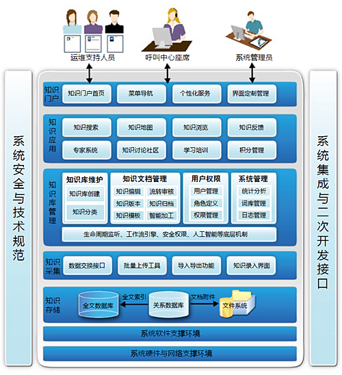 根據(jù)金融業(yè)用戶的需求,TRS運(yùn)維知識(shí)管理平臺(tái)功能框架自下而上可分為知識(shí)存儲(chǔ)、知識(shí)采集、知識(shí)庫(kù)管理、知識(shí)應(yīng)用、知識(shí)門戶五大功能層,完全覆蓋用戶提出的所有功能需求。并且充分考慮系統(tǒng)安全,遵循技術(shù)規(guī)范,提供對(duì)外集成以及二次開(kāi)發(fā)的接口與服務(wù)。