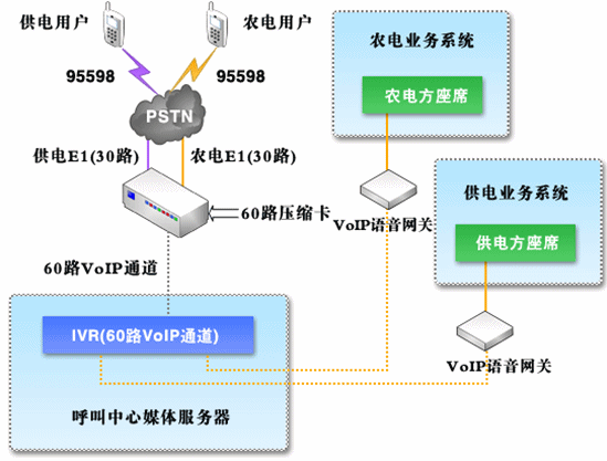 由于要保證供、農電統一95598號碼的接入,呼叫中心系統采用供、農電合一的方式,建立統一的呼叫中心系統,并保證系統接入容量及其他資源能夠滿足統一的要求;在自動語音菜單中,分別設立供、農電用戶層,用戶可以自行區(qū)分、選擇進入相應的導航菜單中,確認之后,系統默認記錄該用戶的類型,再次呼叫時,系統自動識別該用戶供、農電類型;在確認了用戶類型之后,用戶選擇轉接人工座席時,自動進入相應的供電座席組或者農電座席組,并且,在確定轉接錯誤分組之后,可以由座席進行再次轉接。