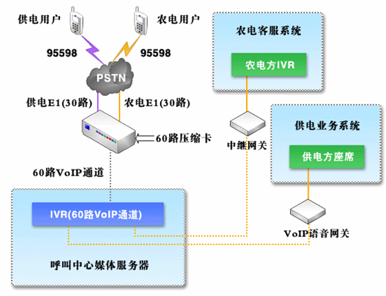 對于呼叫中心系統,由95598特別號碼統一接入,并且在供電呼叫中心系統與農電呼叫中心系統之間采用中繼方式(模擬中繼或者數字中繼,視農電方實際情況而定)進行話路連接,同時保證系統接入容量及其他資源能夠滿足統一的要求;在自動語音菜單中,分別設立供、農電用戶層,用戶可以自行區(qū)分、選擇,對于農電用戶在確定用戶類型之后,通過中繼將話路轉接到農電方呼叫中心系統。