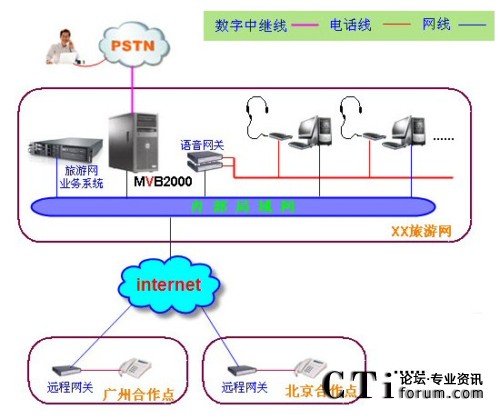 在技術(shù)上,旅游網(wǎng)IP呼叫中心解決方案的語(yǔ)音業(yè)務(wù)通過(guò)電信運(yùn)營(yíng)商的模擬電話(huà)線(xiàn)路(或者模擬中繼線(xiàn)路)接入,數(shù)據(jù)業(yè)務(wù)都通過(guò)互聯(lián)網(wǎng)使用TCP/IP協(xié)議傳送,解決了呼叫中心中大量數(shù)據(jù)傳送的需求,請(qǐng)看下面的網(wǎng)絡(luò)組織結(jié)構(gòu)圖: