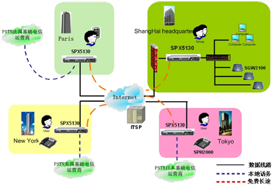 隨著公司在全世界開設(shè)眾多的部門,IP電話技術(shù)將會是不同分公司之間實現(xiàn)低費用高品質(zhì)語音通訊的方式。SINOCO公司的IP-PBX 系統(tǒng)解決方案,利用 SPX-5130設(shè)備通過互連網(wǎng)連接到公司的各個分支機(jī)構(gòu),提供分級體系結(jié)構(gòu),更進(jìn)一步提供了可靠的,靈活的語音通訊解決方案,從而滿足公司快速回應(yīng)客戶的需求。同時,它也降低了總部和分部之間的電話費用?偛亢头植块g昂貴的國際電話費用將不再存在, 而且享受高品質(zhì)的語音通訊質(zhì)量。
