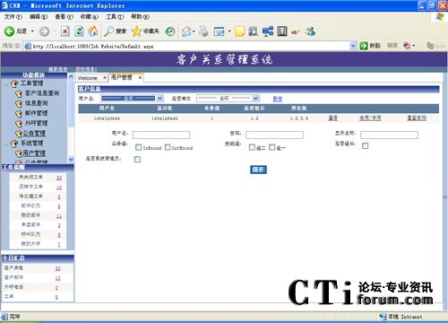 系統(tǒng)配置管理為管理員提供了一個(gè)管理的平臺(tái),來對(duì)系統(tǒng)的用戶、數(shù)據(jù)、參數(shù)、類型等進(jìn)行靈活的配置,從而適應(yīng)快速變化的業(yè)務(wù)需求。系統(tǒng)用戶管理包括座席人員賬號(hào)的設(shè)置、座席組的指定、座席技能的管理以及權(quán)限的分配等。