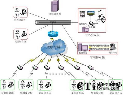 根據(jù)上圖可以知道,在全南縣信用社中心機(jī)房部署一臺(tái)視頻服務(wù)器,這臺(tái)視頻服務(wù)器主要提供各個(gè)會(huì)場(chǎng)進(jìn)行召開會(huì)議訪問(wèn),同時(shí)提供遠(yuǎn)程對(duì)系統(tǒng)管理和維護(hù)功能;在全南縣信用社硬件視頻會(huì)議室部署一臺(tái)帶有采集卡PC主機(jī),這臺(tái)PC用和硬件視頻會(huì)議對(duì)接,由硬件視頻會(huì)議提供一路視頻和一路音頻輸出信號(hào),再把硬件提供輸出視頻信號(hào)接入PC主機(jī)上采集卡上,輸出音頻信號(hào)接入PC主機(jī)聲卡麥克風(fēng)上,這樣只要開會(huì)是把這臺(tái)PC主機(jī)訪問(wèn)視頻服務(wù)器登錄會(huì)議室其它會(huì)場(chǎng)就可以收聽收看到硬件視頻會(huì)議會(huì)內(nèi)容。其它各個(gè)支行和網(wǎng)點(diǎn)會(huì)場(chǎng)通過(guò)金融專網(wǎng)訪問(wèn)視頻服務(wù)器,就可以參加會(huì)議、培訓(xùn)、討論交流問(wèn)題等功能。