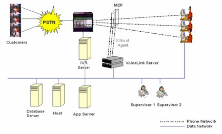 在Voicelink 電話網(wǎng)絡(luò)錄音方案下,語(yǔ)音可以通過(guò)每條的電話線獲得并能連接到Voicelink服務(wù)器上。語(yǔ)音將在Voicelink服務(wù)器里被處理,該服務(wù)器內(nèi)裝有語(yǔ)音卡。通過(guò)電話“摘機(jī)”和“掛機(jī)”的動(dòng)作來(lái)啟動(dòng)錄音和結(jié)束錄音。在TCP/IP的網(wǎng)絡(luò)下,主管可以調(diào)聽(tīng)錄音并通過(guò)登陸到服務(wù)器上進(jìn)行用戶管理。