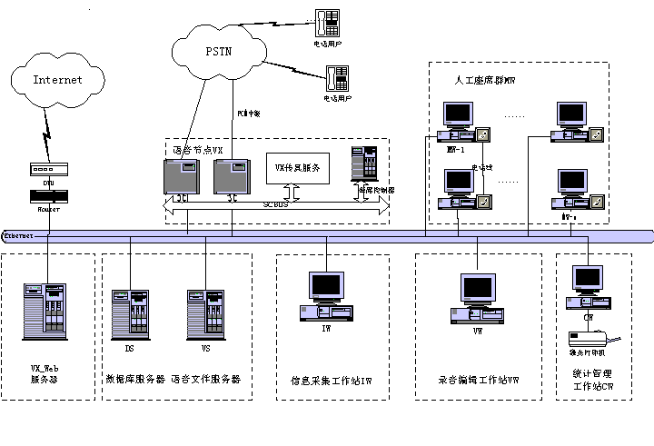 客戶服務中心系統(tǒng)包含智能排隊機(含接入服務器)、核心服務器CCS、交互式語音應答系統(tǒng)IVR、語音傳真服務器、業(yè)務服務器、工作流服務器、數(shù)據(jù)庫服務器、Internet/Intranet服務器、人工座席、尋呼機接口,手機短消息接口等組成。如下圖所示為Runsun呼叫中心系統(tǒng)結(jié)構(gòu)圖: