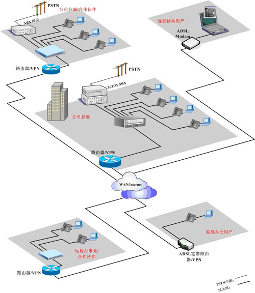 - 采用3COM NBX系統(tǒng)我們可以為用戶提供移動的、靈活的辦公電話系統(tǒng),本系統(tǒng)的遠程Internet接入采用ADSL或?qū)>方式。