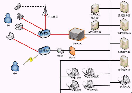 求助中心熱線系統(tǒng)采用華為-3COM 的 NBX100 網(wǎng)絡(luò)交換機(jī)作為呼叫接入設(shè)備,基于純IP交換技術(shù),座席電話全部采用IP話機(jī),部署方式靈活。求助中心系統(tǒng)主要負(fù)責(zé)受理市民投訴,并派發(fā)到相關(guān)二級(jí)網(wǎng)絡(luò)單位;網(wǎng)絡(luò)單位系統(tǒng)主要負(fù)責(zé)處理中心下發(fā)的投訴單據(jù),并進(jìn)行反饋,同時(shí),網(wǎng)絡(luò)單位也可自行受理投訴,并進(jìn)行相應(yīng)的上傳和下發(fā),多級(jí)網(wǎng)絡(luò)單位之間可實(shí)現(xiàn)級(jí)聯(lián)。為了簡化單據(jù)中轉(zhuǎn)流程,求助中心系統(tǒng)在網(wǎng)絡(luò)派單的基礎(chǔ)上,還結(jié)合自動(dòng)傳真、短信群發(fā)等技術(shù),提供了自動(dòng)傳真派單、自動(dòng)短信派單等多種單據(jù)派發(fā)功能,極大的提高了單據(jù)處理效率。