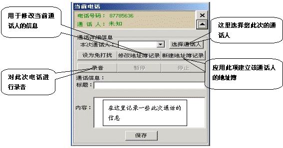 如果有電話打入時(shí),在屏幕的右側(cè)會(huì)彈出一個(gè)對(duì)話框,它顯示了當(dāng)前來(lái)電的號(hào)碼和通話人(如果在地址簿中沒(méi)有記錄則顯示為未知),點(diǎn)擊彈出全部菜單功能,它相當(dāng)于一個(gè)功能強(qiáng)大的通話記事本,用它既可以邊接聽(tīng)電話邊整理相關(guān)通話的文字記錄,又可以錄下通話的全部?jī)?nèi)容。如果這個(gè)電話是您不愿接聽(tīng)的,也可以將它設(shè)置為“免打擾”,這樣,這個(gè)號(hào)碼以后將存入免打擾名單中,若此號(hào)碼再呼入,系統(tǒng)將自動(dòng)掛斷此呼叫。如果這個(gè)電話是您認(rèn)為的重要客戶(hù)打過(guò)來(lái)的,您也可以將此號(hào)碼添加到重要客戶(hù)組中,以便您今后接聽(tīng)或設(shè)置電話轉(zhuǎn)移時(shí)能與其它呼入電話相區(qū)分。