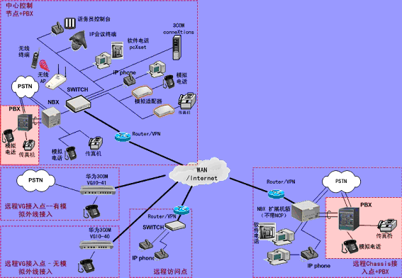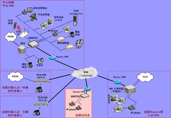 ③.遠(yuǎn)程接入的辦公室不再需要專(zhuān)用的 PBX, 只需要將3Com NBX電話終端接入到WAN網(wǎng)中,就能地實(shí)現(xiàn)在WAN或Internet上與3Com