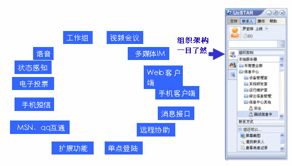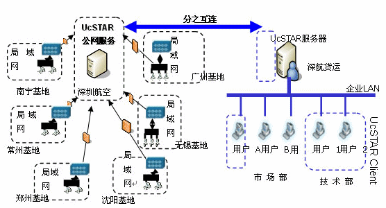 UcSTAR :Unified Communication Star,是深圳市擎旗信息技術(shù)有限公司推出的企業(yè)級融合通信平臺。是融合多種通訊手段(IM、文件、視頻、語音、EMAIL、SMS、電話、VOIP、MSN/QQ互通),融合企業(yè)的多種應(yīng)用系統(tǒng)緊密集成(OA、CMS、ERP、EIP、Portal、網(wǎng)站、應(yīng)用軟件),交流對象和交流內(nèi)容可管理,可控制,可擴展,輕松實現(xiàn)部署企業(yè)的統(tǒng)一工作平臺。 UcSTAR能統(tǒng)一消息、統(tǒng)一溝通、統(tǒng)一管理、隨意選擇多種溝通手段,深航一直在找這樣的一種產(chǎn)品,公司信息部門從上到下給予極高的重視,商務(wù)的過程也都開了綠燈,一路順暢。