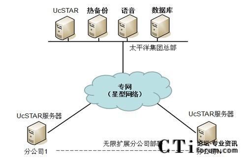 通過UcSTAR統(tǒng)一通信系統(tǒng)實(shí)現(xiàn)以公司總部為主的星型架構(gòu)的通信系統(tǒng)部署,實(shí)現(xiàn)集團(tuán)內(nèi)部的溝通與協(xié)作應(yīng)用。