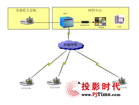 傳輸網(wǎng)絡(luò)采用4M專線,整個系統(tǒng)由控制中心、市政府主會場和18個區(qū)縣分會場組成,在控制中心配置MCU、網(wǎng)管和電視墻多畫面顯示單元,通過網(wǎng)管對系統(tǒng)實(shí)行設(shè)備的統(tǒng)一管理和會議資源的統(tǒng)一調(diào)度,控制中心配置18路電視墻集中顯示單元,通過電視墻,可實(shí)時監(jiān)看18個區(qū)縣分會場情況。在市政府主會場和18個區(qū)縣分會場,各會場配置1套高清晰視頻會議終端,各會場終端4M專線接入控制中心,實(shí)現(xiàn)全市電子政府的視頻會議系統(tǒng)。系統(tǒng)建設(shè)完成后,可實(shí)現(xiàn)導(dǎo)演控制、主席控制、點(diǎn)名發(fā)言、會場輪巡、攝像機(jī)遠(yuǎn)控、電視墻、多畫面、多方混音等視頻會議系統(tǒng)功能。