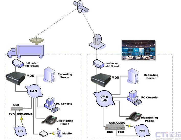 Zed-3的車載調(diào)度系統(tǒng)支持多種接口,通過無線網(wǎng)關(guān)提供的GSM、CDMA或模擬中繼端口,可以實(shí)現(xiàn)與固定電話、手機(jī)等外部電話的互通。即使在現(xiàn)場(chǎng)沒有任何可用的外線資源,例如沒有模擬電話接口,手機(jī)卡沒有信號(hào),也仍然可以通過衛(wèi)星鏈路將呼叫連接到指揮中心的網(wǎng)關(guān)設(shè)備再落地,最大可能的保證現(xiàn)場(chǎng)調(diào)度系統(tǒng)與外部電話的通信。