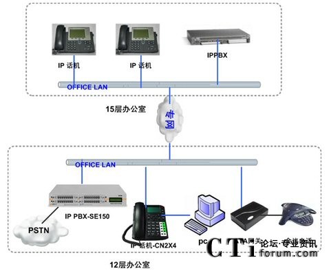 隨著企業(yè)規(guī)模的不斷擴(kuò)展,公司在15層新增約50人的辦公區(qū),需要和12層實(shí)現(xiàn)內(nèi)部通訊免費(fèi)(直撥分機(jī)號(hào)碼),出局路由沿用現(xiàn)有ISDN線路,F(xiàn)有的傳統(tǒng)的集團(tuán)電話設(shè)備已經(jīng)滿配,無法適應(yīng)企業(yè)規(guī)模的擴(kuò)張,無法跨地域組網(wǎng),不能建立多點(diǎn)分布式的內(nèi)部電話系統(tǒng),不能充分利用現(xiàn)有的IP網(wǎng)絡(luò)資源發(fā)展有助于提高企業(yè)競爭力的網(wǎng)絡(luò)增值業(yè)務(wù)。