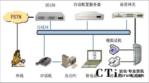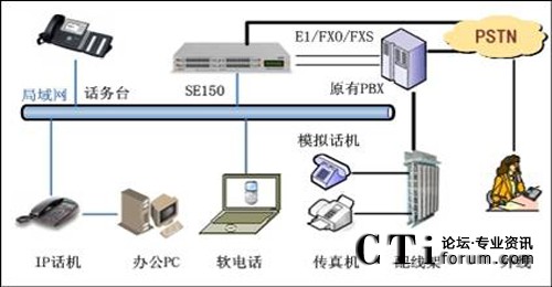此方案適用于已經(jīng)部署了傳統(tǒng)PBX的企業(yè)。要求企業(yè)部署好數(shù)據(jù)網(wǎng)絡(luò),如果采用模擬終端,則企業(yè)的各個辦公點需要先將網(wǎng)絡(luò)線路和電話線路部署到位,同時企業(yè)原有的PBX要預(yù)留與SE150對接的接口。