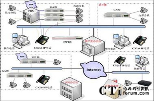 由于總部的網(wǎng)絡(luò)帶寬充足,因此部署了一臺核心IP PBX服務(wù)器——MCS1000。負責(zé)處理來自GA90、CN2x4、以及軟件電話的語音業(yè)務(wù)并給該系統(tǒng)配置一個公網(wǎng)的IP地址,適合于移動辦公的公網(wǎng)用戶,及沒有實現(xiàn)VPN的辦事處的接入,直接通過公網(wǎng)注冊到該核心系統(tǒng)上來,然后通過相關(guān)的配置,統(tǒng)一管理下屬的語音終端設(shè)備。