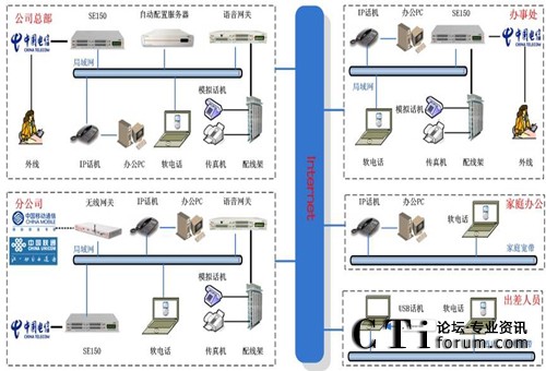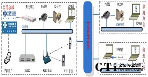 此方案適用于具有“移動辦公、頻繁出差、家庭辦公”需求的企業(yè)。系統(tǒng)要求企業(yè)內(nèi)部部署好數(shù)據(jù)網(wǎng)絡(luò),如果采用模擬終端,則企業(yè)的各個辦公點需要先將網(wǎng)絡(luò)線路和電話線路部署到位。如果需要應(yīng)用WIFI終端,則需要部署WIFI網(wǎng)絡(luò)。