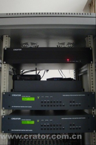 AV作為整個控制系統(tǒng)的核心;使用CREATOR快捷的VGA0808、AV0808矩陣切換器進行音/視頻信號的相互切換;采用CREATOR配備的周邊設備對會議廳的電力環(huán)境進行智能操控。