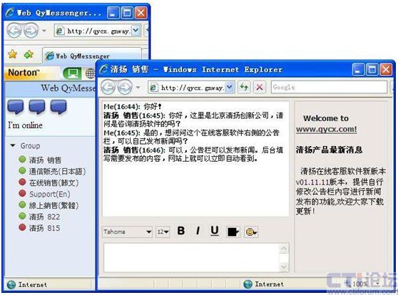 Web即時(shí)通信,對(duì)任意地方的客戶,是用IE即可以訪問(wèn)"對(duì)話"。所以,它虛擬出一個(gè)銷(xiāo)售人員的接觸途徑。