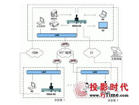 如圖所示,主會(huì)場(chǎng)配置1臺(tái)愛(ài)斯樂(lè)VegaX5終端,X5最高帶寬可達(dá)4Mbps。內(nèi)置8點(diǎn)混網(wǎng)(IP&ISDN) MCU。在每個(gè)分會(huì)場(chǎng)采用1臺(tái)愛(ài)斯樂(lè)VEGA X3終端。各會(huì)場(chǎng)根據(jù)網(wǎng)絡(luò)情況,可以采用不同的網(wǎng)絡(luò)接入方式。VEGA X5可以支持寬帶IP、ISDN、專(zhuān)線接入等。且X5的內(nèi)置MCU在召開(kāi)多點(diǎn)會(huì)議時(shí)可以做雙視頻流傳送,可以同時(shí)看到多會(huì)場(chǎng)的圖像,聲音也是全部混合的。
