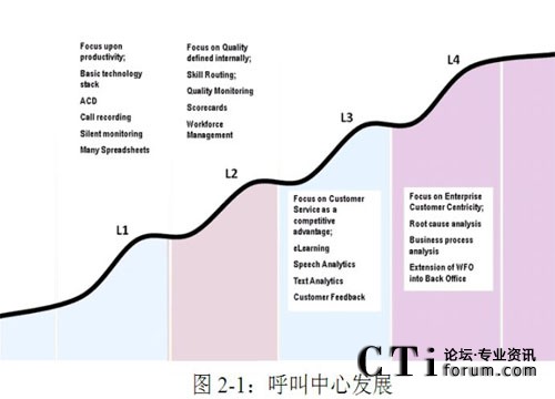 在現(xiàn)實(shí)中,還存在零程度的呼叫中心,這一點(diǎn)并沒有體現(xiàn)在呼叫中心發(fā)展路線圖上。零程度的呼叫中心就是那些在運(yùn)營過程中并沒有很好地認(rèn)識到自己角色以及對自己未來的發(fā)展毫無計(jì)劃的呼叫中心。